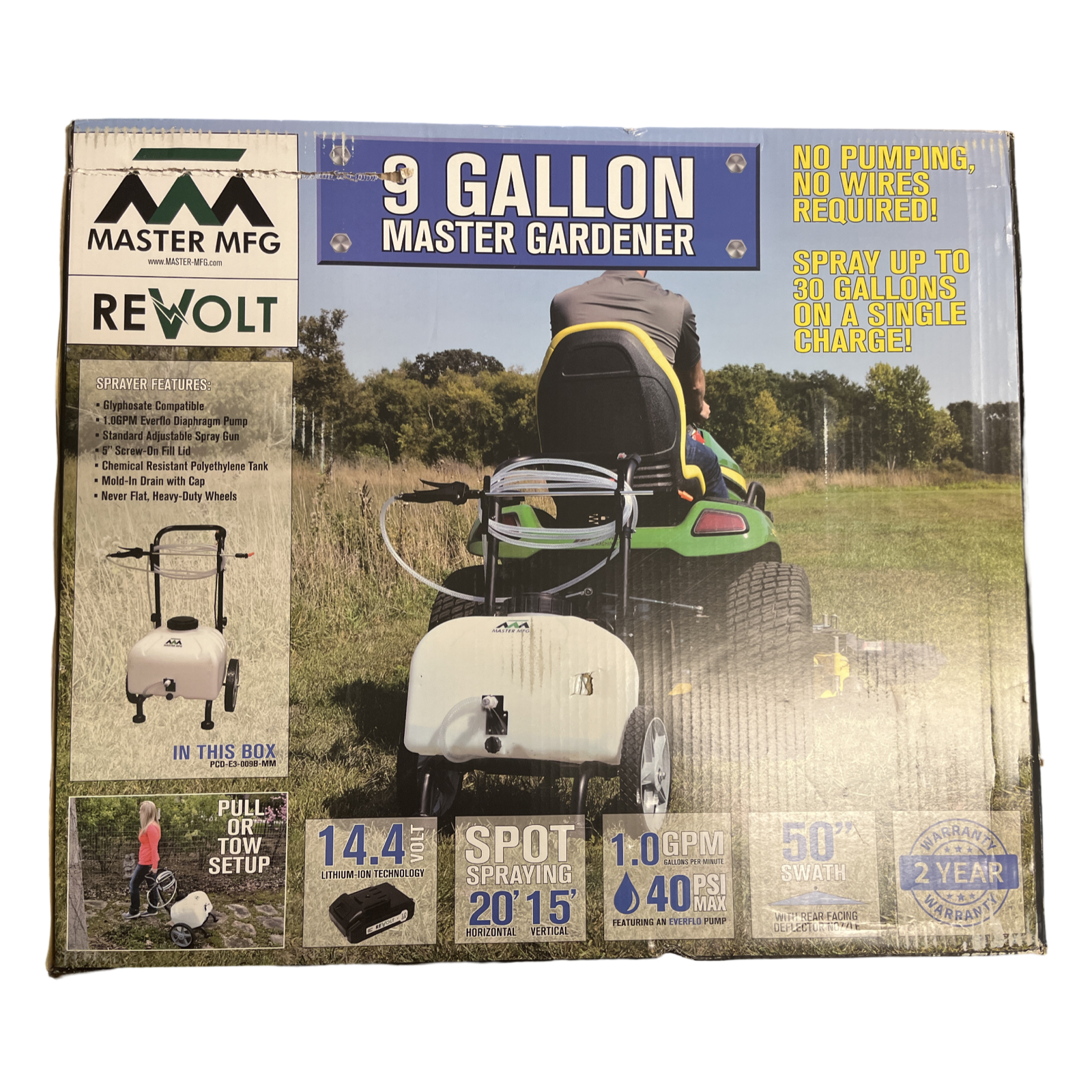 Master Your Spraying Tasks with the Master Manufacturing Revolt Lithium-Ion Series 9 Gallon Pull & Tow SprayerTake control of your spraying needs with the Master Gardener, a versatile and powerful sprayer designed to get the job done. With an internal Everflo 1.0GPM 12V on-demand diaphragm pump, you can enjoy continuous flow and adjust to your surroundings by pushing, pulling, or hitching it to a lawn mower or ATV with the included hitch adapter.Navigate rough terrain with ease using the heavy-duty 12-inch wheels, and customize your operation with an adjustable all-steel frame handle that provides increased comfort and compact storage. Additional features include a 15-foot nylon hose for hard-to-reach spraying, a lighted on/off power switch, tank lid strainer to prevent debris buildup, and a 9-gallon translucent tank with a molded-in drain port for easy draining.Perfect for watering, de-icing sidewalks, and applying herbicides and pesticides around the house, the Master Gardener is approved for use with Round-Up. Backed by a two-year warranty on pump and components, this sprayer is designed to deliver reliable performance.Revolutionize Your Spraying Experience with the Revolt Series Rechargeable Lithium-Ion BatteryWith the included 14.4V lithium-ion battery pack, you can easily spray up to 30 gallons on a single charge. The internal docking system protects your battery from harsh weather elements and chemicals, while the included battery charger re-energizes your battery pack in under four hours.Target Weeds with Precision Using the Adjustable Spot Spray GunConquer isolated weeds with ease using the included adjustable spot spray gun, featuring an 18-foot vertical and 20-foot horizontal reach. Quickly adjust the nozzle from a steady stream to a wide mist to suit your application needs. The traditional spray gun also includes a trigger lock to reduce hand fatigue and an in-handle filter for increased durability.Broaden Your Spraying Options with the Single Broadcast Deflector NozzleSave time and spray more ground with the single broadcast deflector nozzle, which provides a 50-inch spray swath. With a compact setup, you can easily prevent damage from oncoming obstacles such as trees.